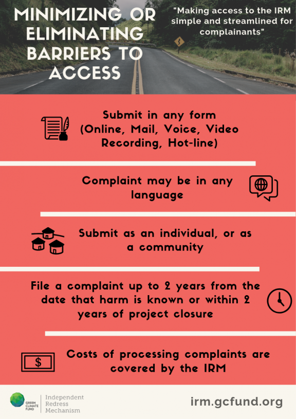 The IRM is committed to providing ease of access and a streamlined avenue to redress. The new procedures reflect this by reducing or eliminating barriers for complainants to access the IRM. In practice, complainants (whether an individual or a group or community) can submit a complaint in any language, through any medium and up to two years from the date the harm becomes known or within 2 years of project closure. The IRM bears the costs of the complainant’s meaningful participation in its proceedings, and complainants and other parties are kept in the loop throughout. Pushing the envelope further, the IRM is able to recommend redress to the GCF Board in the form of compensation and/or actions to bring a GCF project into compliance with GCF policies and procedures. Complainants can be represented by anyone they choose to appoint, including their government.